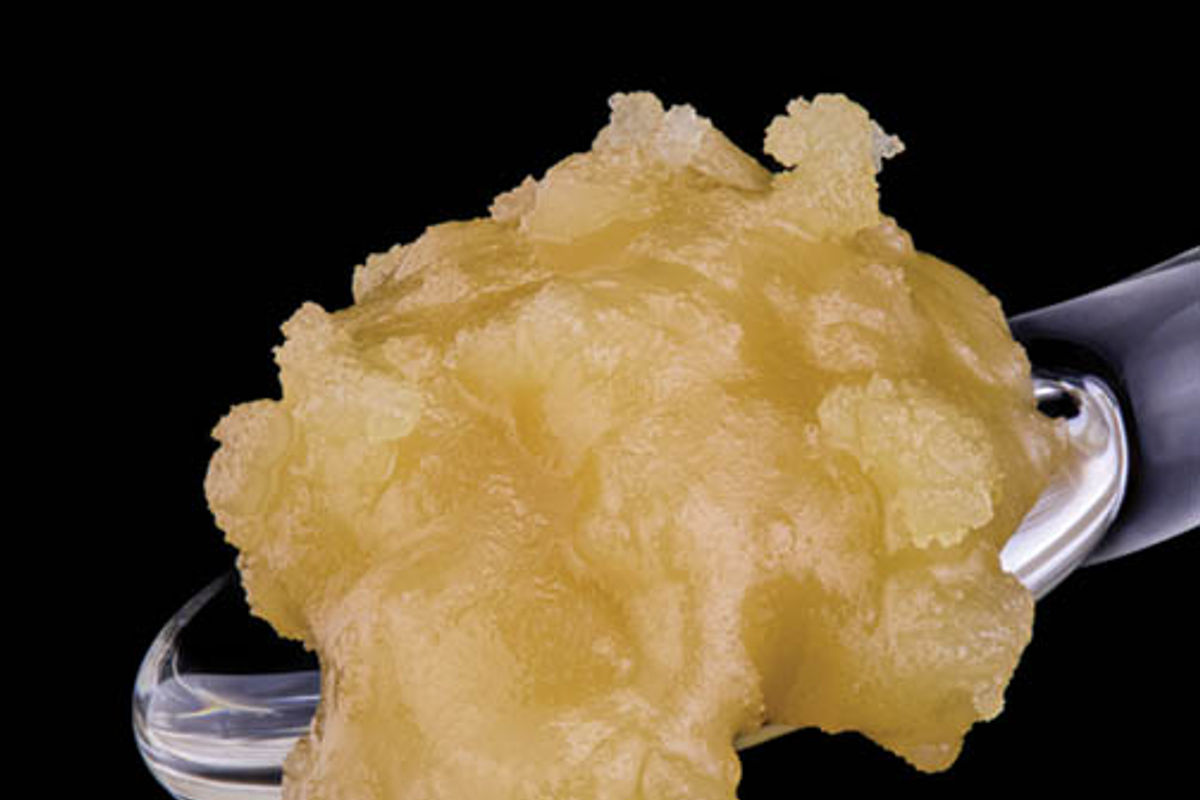 The Orange Berry Fizz Rosin is a pale, opaque yellow-gold color with a shimmer of terps that highlight the rosin’s curves. The texture is light, airy and wet but still easy to transfer from tool to nail.