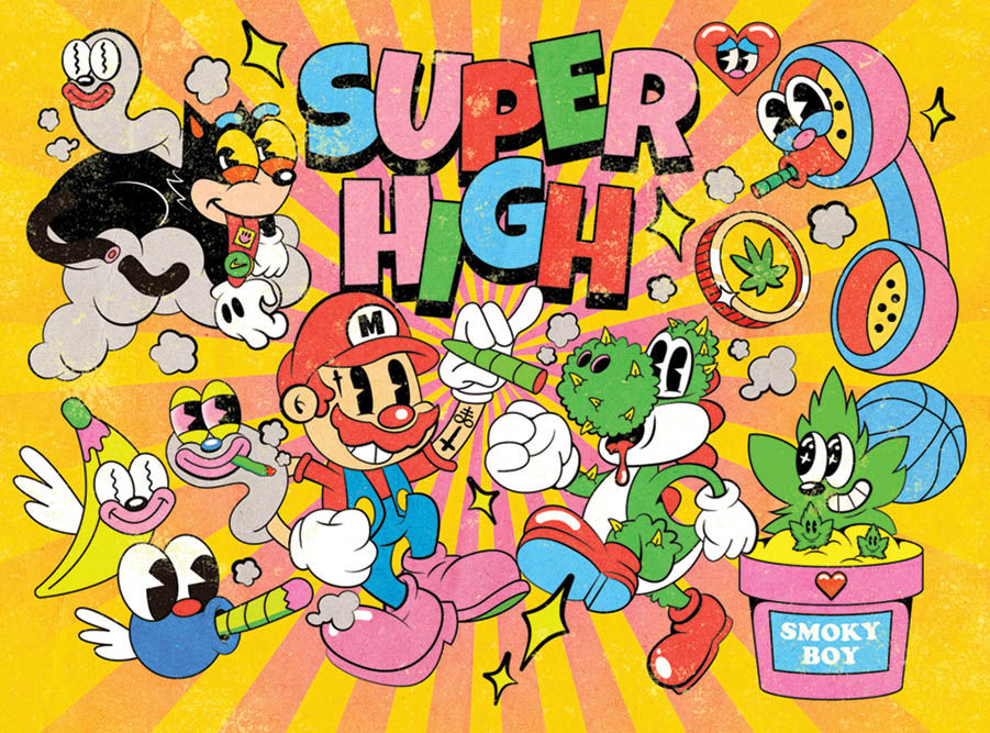 One of the easiest ways to sum up their work is Betty Boop on acid, and indeed there is a focus on cartoonish hedonism in their colorful illustrations. Many of their pieces feature smiling bongs, dancing nugs, or flowers and clouds sharing cartoonishly large joints, but despite having a running theme of consumption in their work, they told us that they don’t consider themselves big stoners. “We actually don’t smoke that much,” Darlene said in our interview. “We collaborate with brands in the Cannabis space mainly because our style fits so well with that culture: bold characters, humor and a bit of chaos.”