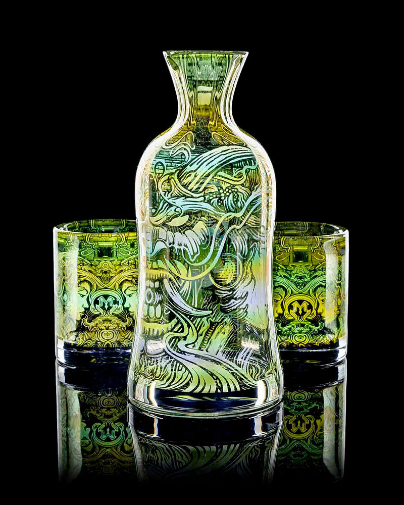 To say Mothership Glass never disappoints is certainly not an exaggeration in this case. The level of intricacy in the patterns on both of these sake sets is stunning. With a tokkuri and matching cups from the “Temple” and “Dragon’s Gate” series, these sets command a presence anywhere they go. Along with clean lines, perfect shaping and insane graphic details is the perfection in wall thickness and finishing touches that Mothership is known for. If you are looking for a gift for the sake lover in your life, you may have found it. –Photographer: Mothership Glass