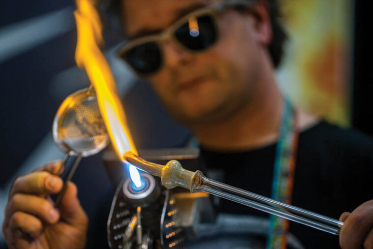 On the technical side, Muller’s daily workhorse is a 40-millimeter torch created by the famed German company Herbert Arnold Gruppe. Muller said that his “Herbie” gives optimal core heat that allows him to apply his specific skills in melding together glass. Also integral to Muller’s process is Luken Sheafe, better known to industry folks as Salt. To this day, Muller said, “Salt is who I call when I can’t figure something out, whether it’s glass- or life- related. He’s an amazing human who has great ideas and solutions to share.”