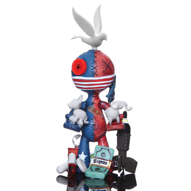 Known for his stitched and patchwork characters, Muller said a lot of his inspirations came from the creations dreamed up by Tim Burton, Dr. Seuss and Edward Gorey. Muller said, “I wanted to create a creepy-cute thing, something that stands alone, something that speaks without words.” And out of this line of creation, the voodoo doll aesthetic was born. Muller hopes that through his designs, “adults and children alike can effortlessly engage with the arts and be inspired by the limitless possibilities of the imagination.” Collaborations are a constant norm in his archive, and his way of fusing (pun intended) another artist’s unique aesthetics with his own is seamless.