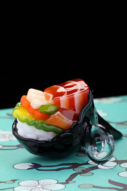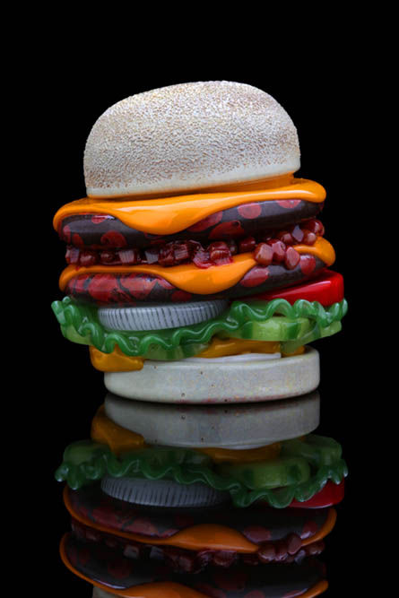 Rosburg continued to develop his craft in Colorado until 2016, when he landed in The Whiteaker, an arts district and well-known mecca for glass artists in Eugene, Oregon. He’s still there today, continuing down the rabbit hole, where his use of borosilicate glass and flameworking creates stunningly realistic pieces of art that supersede many others who attempt the same craft. The first piece I saw of his was an extremely realistic miniature burger pendant. I was blown away by the level of detail and proportion; needless to say, I’m still a fan to this day.