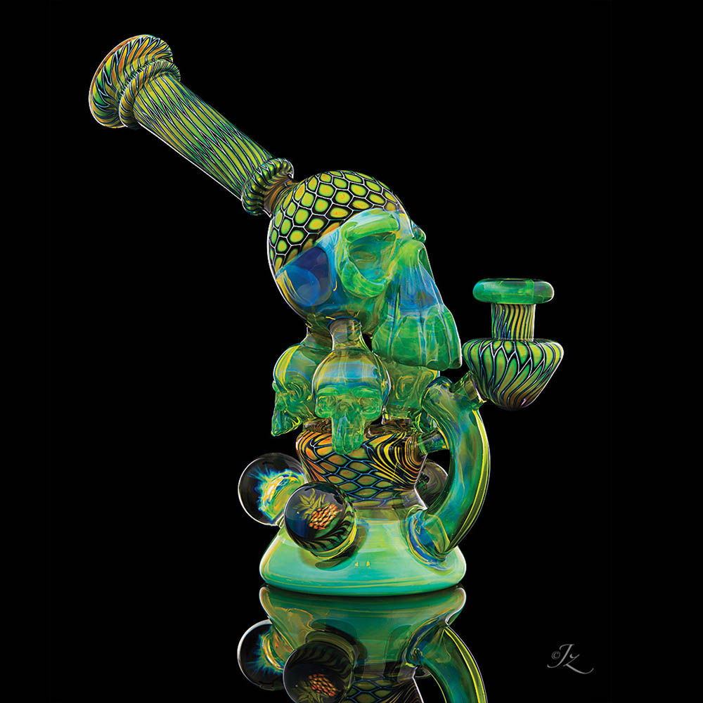 Jacob Weil was born in Spokane and started blowing glass in 2015 after watching a YouTube video on how to make a bong with a friend. “We took a bunch of Pyrex beakers and mixing rods from our high school lab to try making our own, which just sort of spiraled into me finding whatever glass I could and melting it.” Now, Weil Glass (pronounced why-ill) is known for his super sick quad skull bubblers and highly detailed crystal catacombs. With stunning blue and green hues, these collab pieces with fellow Washington artists Walmot Glass and Hondo Glass show out for the PNW and will absolutely shred your face off.