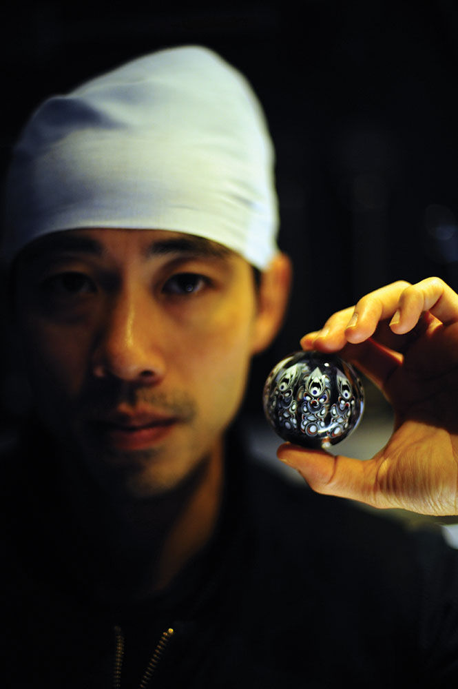 After failed attempts to get into Amsterdam and then London, he decided to return to Japan voluntarily rather than be deported. By 2001, Kondo had a job at a clothing store in downtown Tokyo making handmade jewelry out of hemp rope. He was looking for something to put on the end of the ropes for decoration, and after noticing a guest artist in the shop selling pendants made with borosilicate glass, Kondo was inspired to try making his own.
