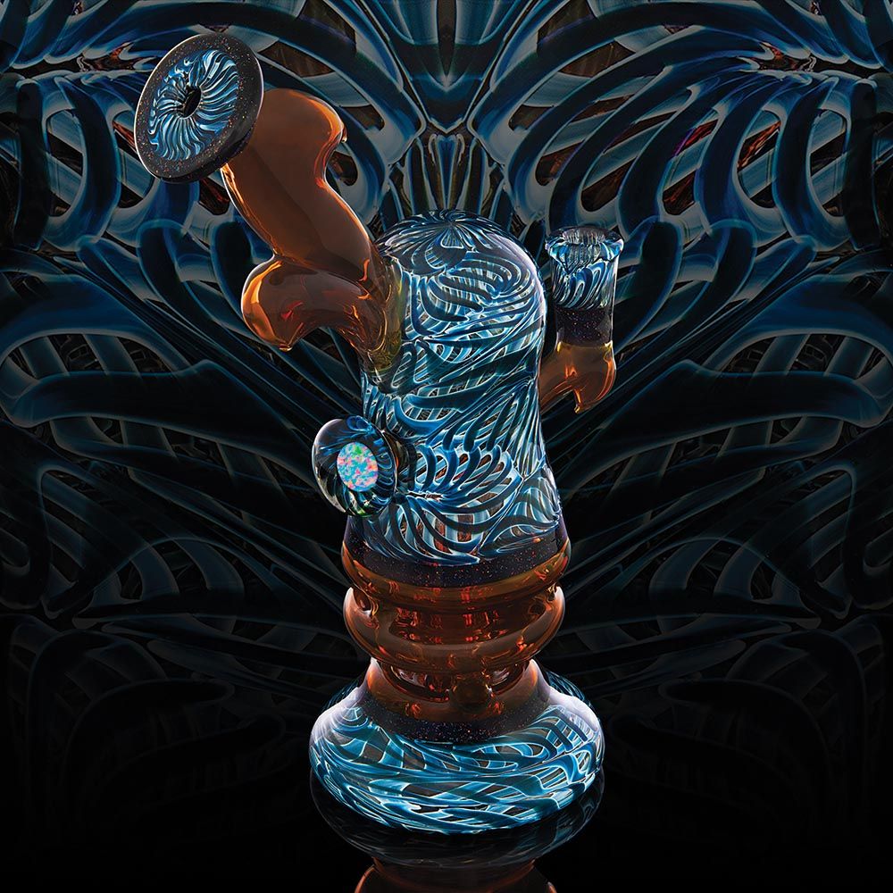 Swan says his style is all about, “Capturing the best colors of the glass and utilizing flowing, curving shapes influenced by ornamental filigree scrollwork.” You can see this highly detailed technique showing out on his collab with Walmot Glass, another Seattle-based artist known for his bloopers and recyclers. The filigree scrollwork is done using glass with silver-reducing properties, which change the color of the surface once blown. Then, Swan sketches out the design by hand, carefully carving away with a diamond-tipped Dremel to reveal contrasting colors.
