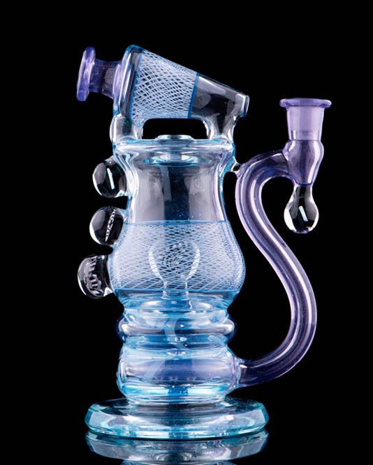 This piece was constructed with custom Ghosted marina and Purple Rain, Peacock over China White pinnie and rettichelo. The marbles are encased Opals, Checkerboard and Signature Milli. A 6x3x3 Blooper diffuser gives this beast the chug. A 10mm female fitting hold your bucket, this piece stands 7.75” tall and has a retail value of $1500.