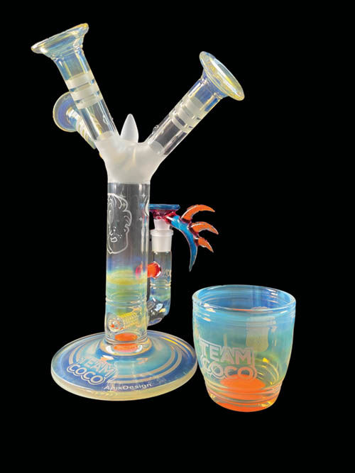 The result is what Bleyaert called the “Chill Chums Bong,” a 15-inch tube that splits off into three mouthpieces and flows down over a gridded stemline. The faceted bowl features three orange spiral horns to signify Conan’s signature hair, and the tube is emblazoned with Easter eggs like Conan’s signature doodle, some gerbils to reference the podcast and a big Team Coco logo. Along with the tube, Dan also created a set of glasses, ashtrays and a special Sherlock pipe for co-host Sona Movsesian. As the first glassblower ever interviewed by Conan, he felt, “Why not come in guns blazing.”