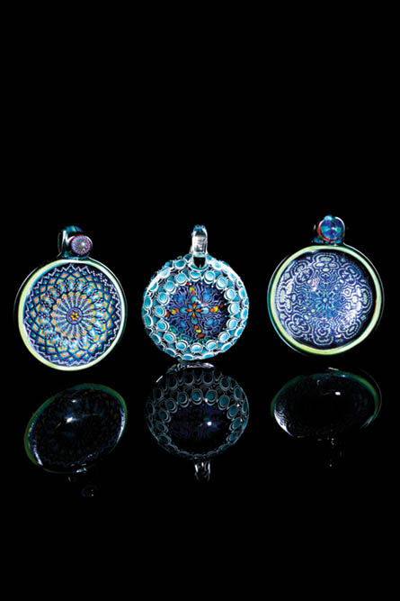 Each member of Team Japan brings their unique style and approach to glass art. Kojima and Miyake are known for their intricate use of pointillism in glass, a first-of-its-kind design, and both are true masters of their craft. Using thousands of dots in tight, intricate patterns, these guys create a larger image from a microcosm of colorful dots. The beautiful patterns are done with such precision that when I first saw one, I couldn’t believe it was man-made. Some are more focused on patterns, while others depict images like Grateful Dead’s Steal Your Face logo or artistic land, sea and skyscapes.