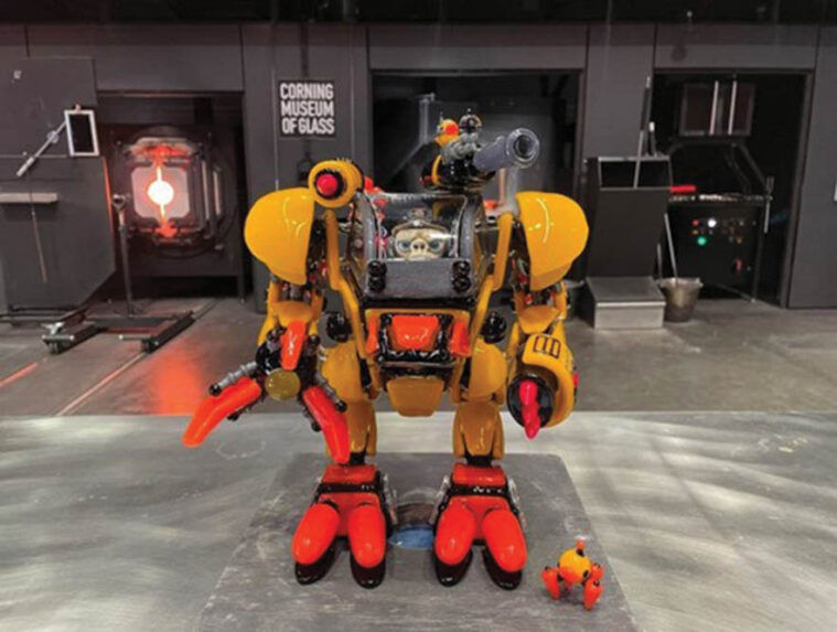 The event will return for its fifth year in May 2026, inviting a team of artists to spend a week at the museum’s Amphitheater Hot Shop. During that time, the group is challenged to melt their respective styles and visions together, creating one cohesive, sculptural piece. When asked how they choose their artists, Goldschmidt said the team at CMoG works each year to identify an individual with a strong portfolio of collaboration work, and then, like a heist movie, asks them to name their two- to three-person dream team to pull off one epic job. That first year, Dan Coyle called in Adam Whobrey (Hoobs) and Ryan O’Keefe (Ryno) to create a futuristic piece dubbed “D-XG 2052.”