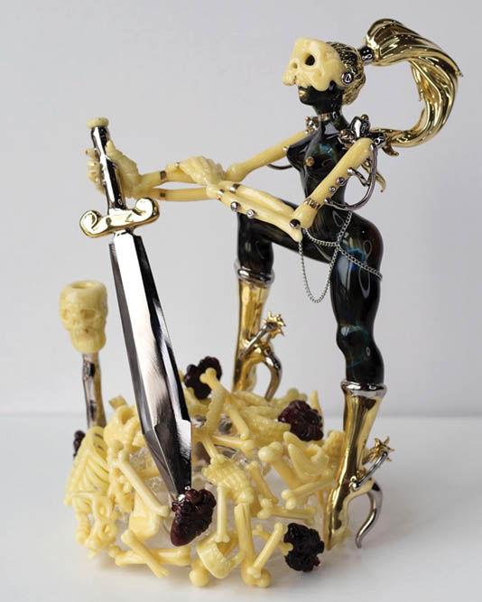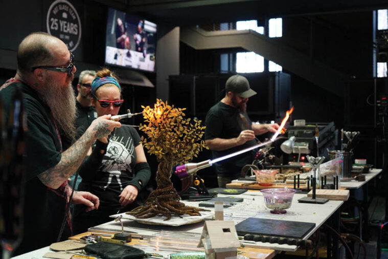Since then, artists like Phil Seigel, Solfire, HicDogg, Darby and AKM have been invited to share their world-renowned techniques at CMoG. For 2026, CMoG is complementing its major exhibition on Women in the American Glass Studio with a team that Goldschmidt called “some of the strongest women in contemporary flameworking” to illustrate how this legacy remains alive and well. Goldschmidt excitedly revealed to the Leaf that the 2026 lineup includes host Sibelle “Sibelley” Yuksek, along with Adrienne “Babedrienne” DiSalvo and Nicole “ColdBerger” Berger. Glass fans who know DiSalvo’s intricate carvings or remember Yusek and Berger’s fire-spouting collaboration from Oregon’s 2023 DFO glass exhibition know that this will be one for the books.