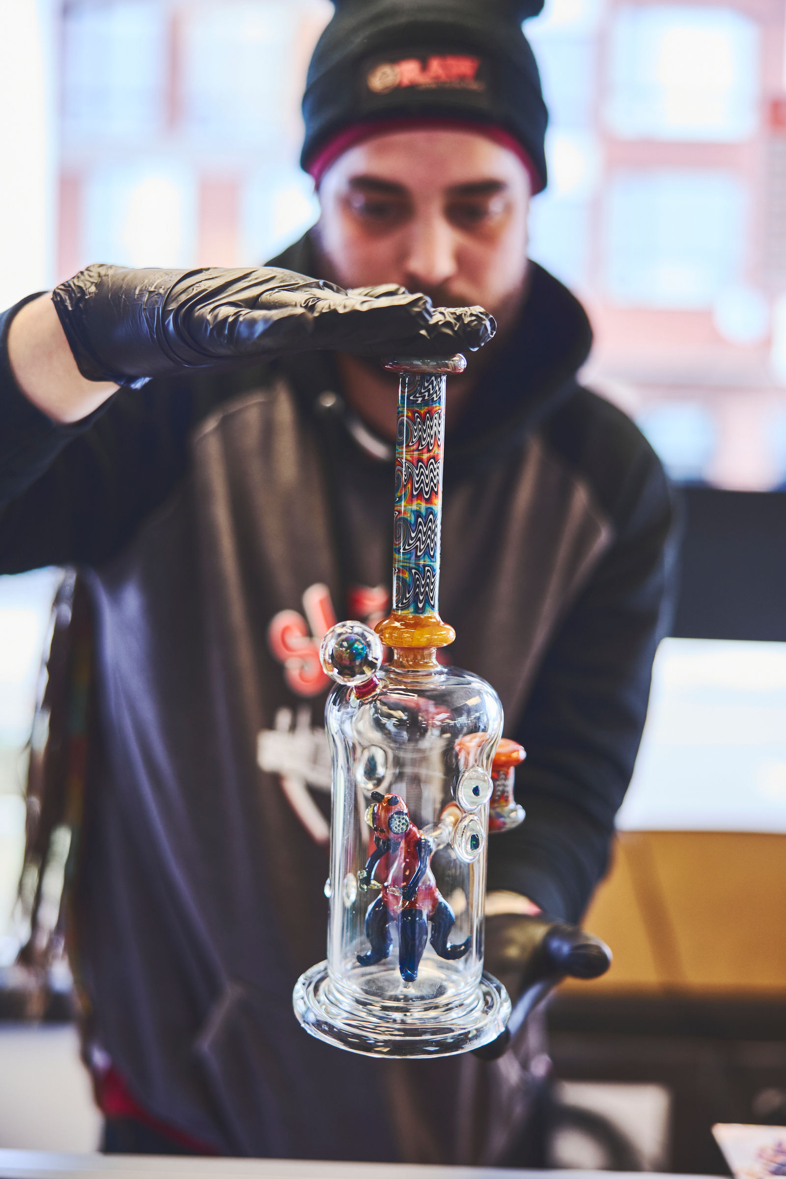 I walked in and was greeted by Zach, who gave me nothing less than a museum-quality tour through the shop and I hadn’t even told him who I was yet. We looked at the gamut of dab rigs – from intricate, full-on Octopi rigs that included Octopi-themed utensils to go with – to clean, simple, classic straight tubes that go straight to the dome. Should you find yourself at this awesome shop, ask to see works by Tom and Dylan Covelle, Slip 303, and the cold-worked sword from Oracle Glass Inc. – all wickedly cool.
