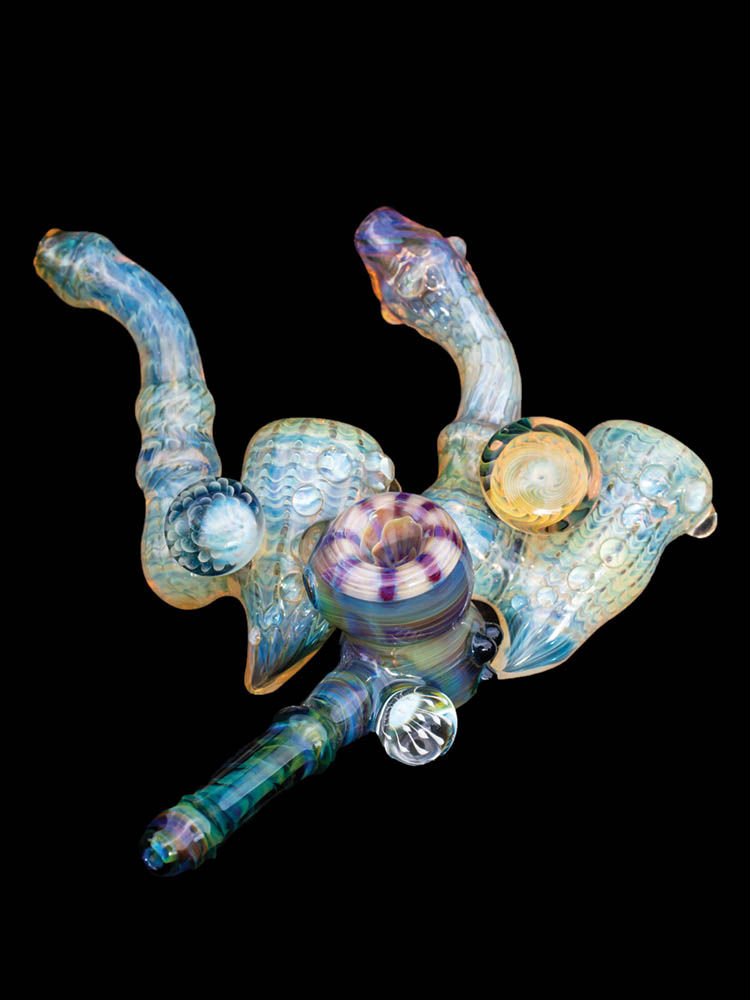 Dominic Garcia’s journey with glass began with a glass bead torch gifted by his mother for Christmas 1998. A fateful accident left him immoble for a year, which became the perfect opportunity to begin his love affair with glassblowing. By 1999, Garcia was working with borosilicate and making pipes in California, and has spent the last 23 years working with glass art and pipes as he’s traveled around the world. Today he works from home on the Kenai, making glass that inspires him … whether it sells or not.