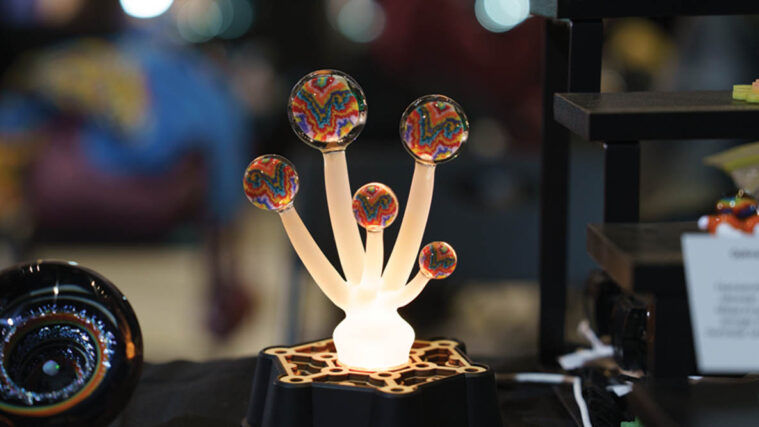 A few personal standouts from this year’s show were Eusheen and Yoshinori Kondo’s epic marble collab, which sparkled so bright that I nearly needed sunglasses, and Jen Stark’s highly anticipated first release of flameworked glass pieces. I was beyond stoked to score a pill made by ENS Glass out of Texas that features a trippy take on Stark’s signature rainbow patterns. Whether you gravitate toward geometric shapes and nature-inspired patterns or like to get lost in a fully-worked window to another world, there was truly a style for everyone to appreciate.
