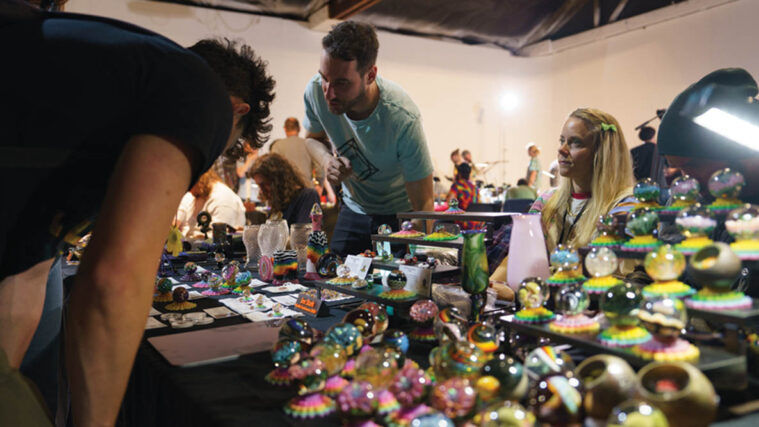 Known affectionately as “MIBCON,” the two-day gathering at Void Studios featured a dynamic lineup of events celebrating modern glass culture. At the heart of it all was the Marble Market: a lively, farmers-market-style bazaar where avid collectors and curious newcomers alike could browse work from some of the most sought-after names in the scene. There were also tons of different ways to engage with artists beyond their booths, from a charity auction to high-energy marble races and even a hidden marble hunt around the venue and surrounding areas.