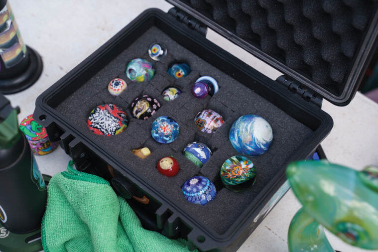 Piper Dan, a Colorado local and OG of marble making, reflected on his own personal journey and evolution in the craft. Starting on the torch in 1995 and getting into marbles just two years later, he recalls those early days with a fond laugh. Marbles were simply “easier to sell on lot and bring into shows” than larger functional pieces. What started more as a matter of practicality has since blossomed into a thriving subculture.