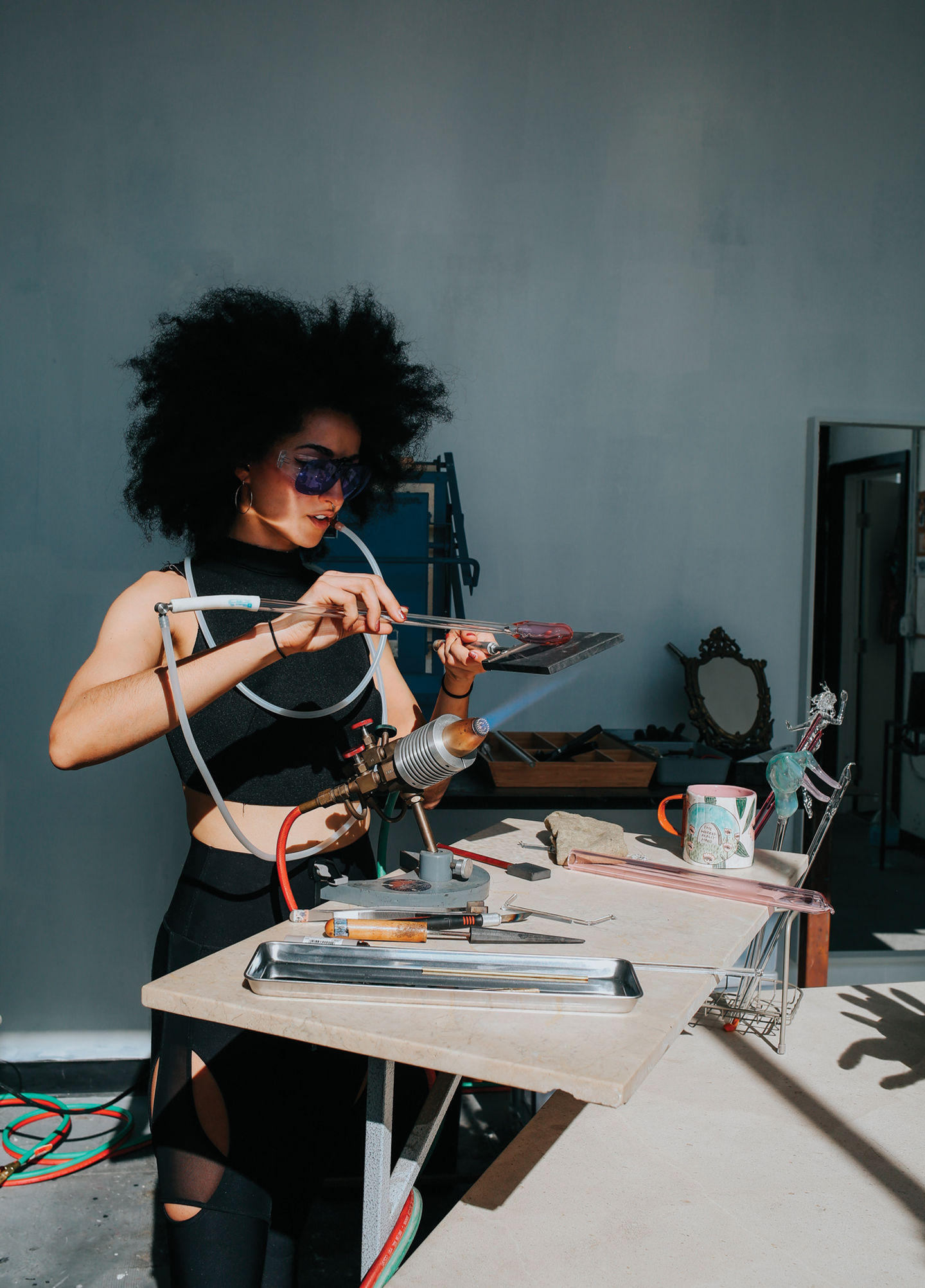 It has. Well, I’ve been working at Neptune Glassworks for the past five years. So, I’ve been doing production glassblowing there. It’s right down the street from here, which kind of sealed us in, because there are a few studios on that block. It’s safe over here, but I still have my distance and I can be a little bit more creative and allow my feminine energy to blossom. The space over there is so masculine, it’s basically like walking into a Mad Max warehouse. Motorcycles, steel, wood, all heavy materials. Me being the only glassblower there for so long, I sort of adapted to the space. I’ve been in Uri’s (her employer) footprint this whole time. He’s been very generous in sharing his equipment with me and allowing me to grow within that space. It just got to a point now where my interests are too much. When clients come to see me, I want to be able to say, “Everything you see in here is my work,” – and it’s total ownership. I’m still over there three days a week, which is awesome. As much as I want to be fully on my own, financially it’s a little bit difficult, especially in LA.