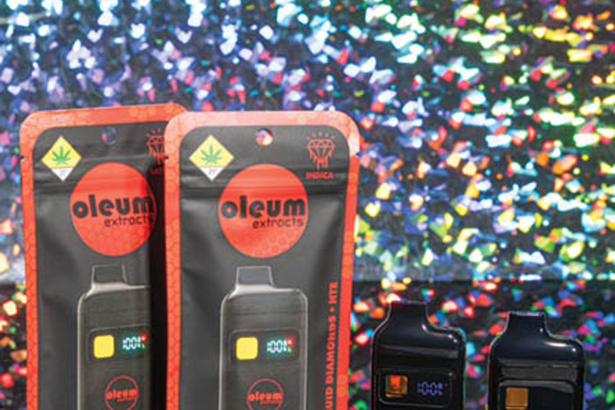 These new disposables feature a digital screen with a battery meter, high- and low-heat settings, and a cold start function for big rips. The live resin terpenes come from the extraction process and are 100% Cannabis-derived, then mixed with liquid THCA diamonds, which are close to 99% THCA and extremely potent. Together, the terps and diamonds provide a full spectrum of flavor and effects that are delicious, potent and easy to discretely rip on the go. With the full taste and flavor of a terpy dab in a disposable format, these new premium offerings from Oleum are ready to deliver big hits for the holidays.