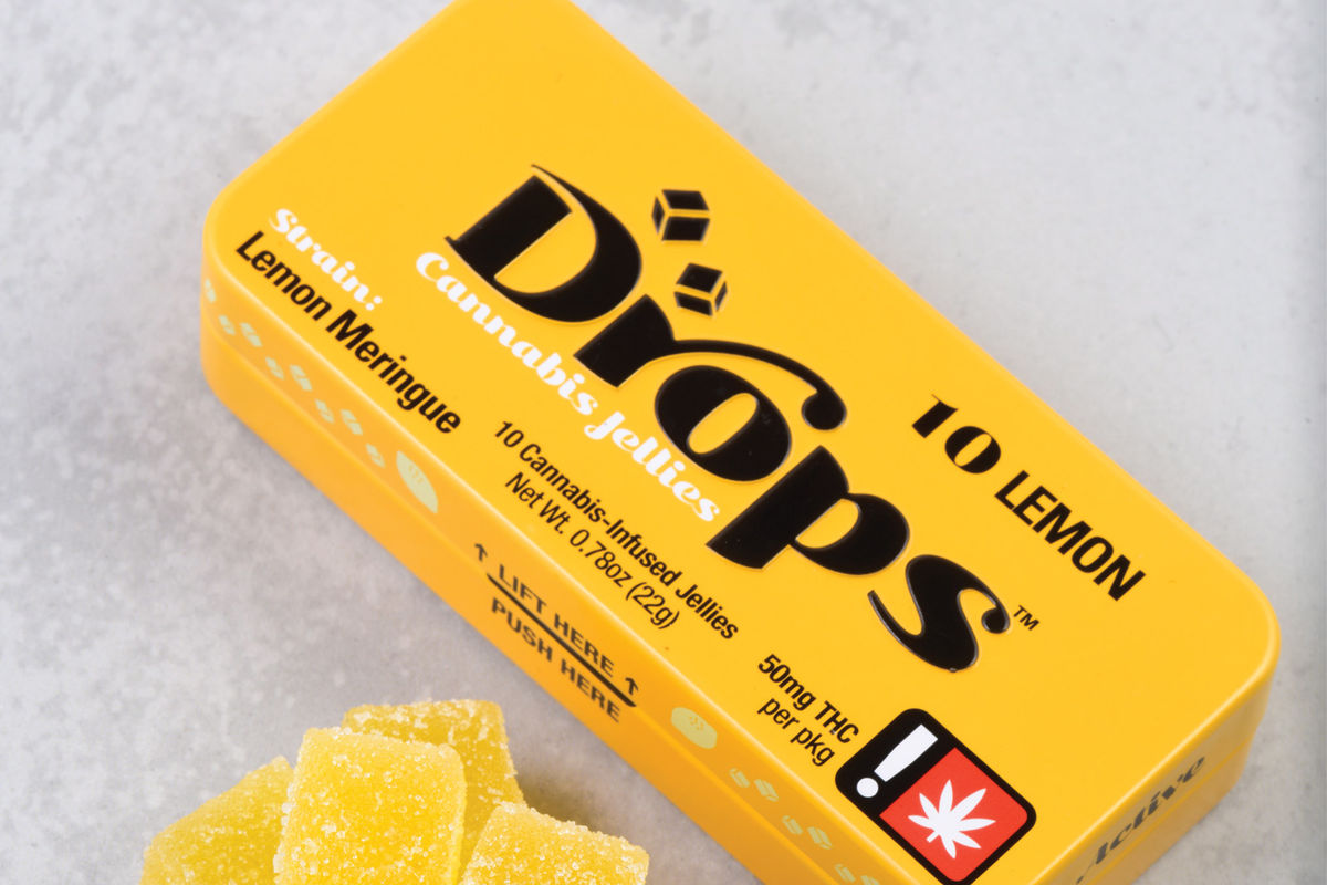 Drops, with their playful tins in a rainbow of colors and strain choices selected to match the candy flavor, definitely hit the “fun” mark. I opted for the Active pack, 10 pieces of bright yellow lemon-flavored gummies infused with lemon meringue live resin at 5mg THC each.