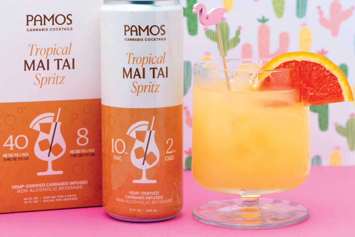 The team at Pamos crafts a number of different lines catering to different tastes and levels of consumption, starting with the session-weight microdose canned cocktails (2mg THC/2mg CBD per can), ramping up to the medium-dose version with 5mg THC, and leveling up to a 10mg version in a 12oz can. The canned cocktails come in a trio of flavors including Tropical Mai Tai Spritz, Long Island Iced Tea and Peach & Guava Bellini Spritz.