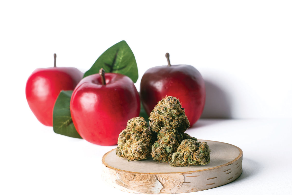 Popping open a jar releases a fresh bouquet of fruits, with an undeniable apple flavor that’s light, refreshing and sweet. As the smell rushes into the nose, a deeper, skunky, sour-gas builds – adding complexity to the flavor and rounding out the strain’s profile as sweet and rich, just like a tasty sherbet. The flower is dense but cured wonderfully, with tightly-trimmed nugs and glistening trichomes that sprinkle kief as the bowl is broken up and loaded.