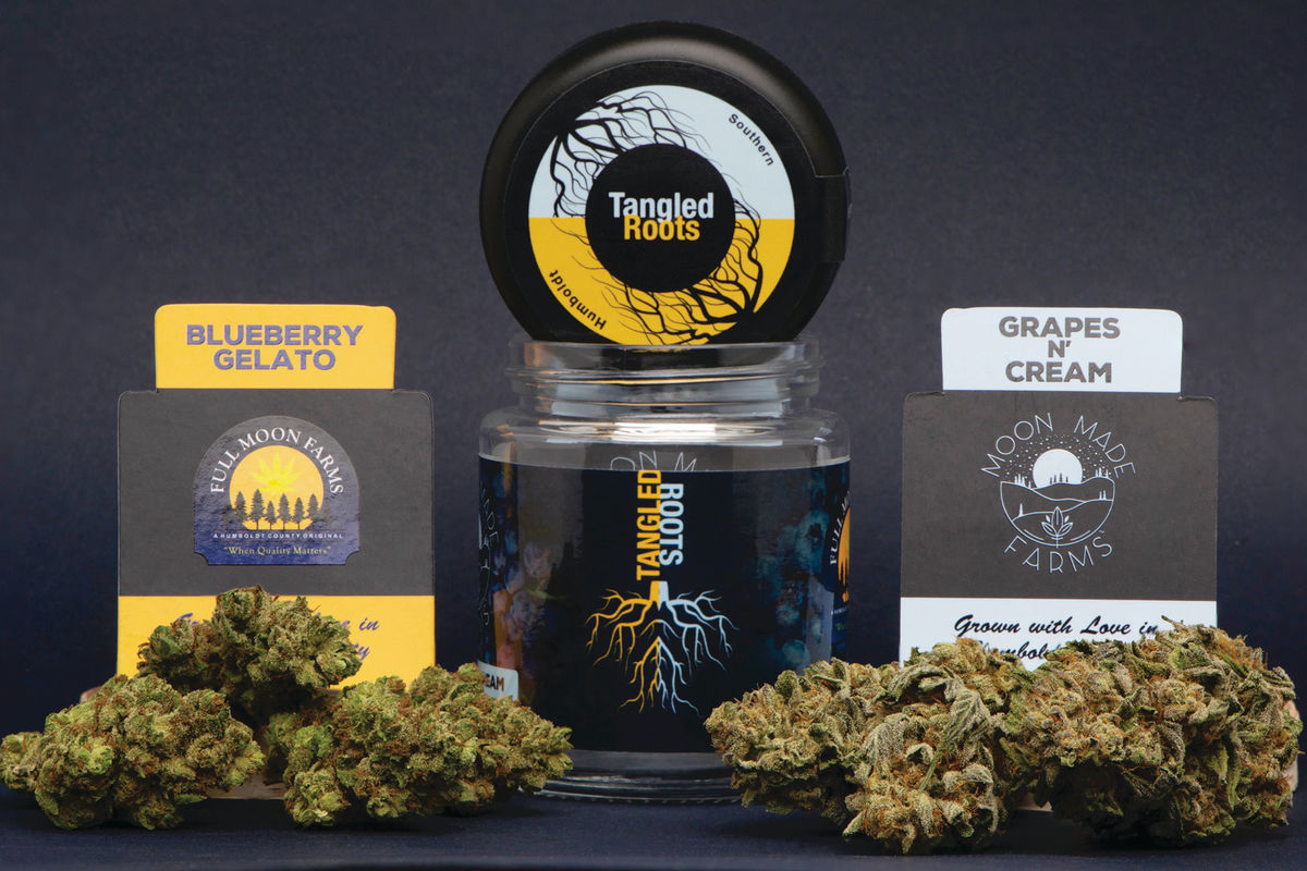 The Tangled Roots label seeks to lend a physical presence to the camaraderie felt by small-plot farmers facing the reality of a swiftly expanding mega-industry. Created and curated by Humboldt farmers John Casali of Huckleberry Hill Farms and Jason Gellman of Ridgeline Farms, the Tangled Roots label unites two strains from two independent, small farms in the same jar, separated by a labeled divider.
