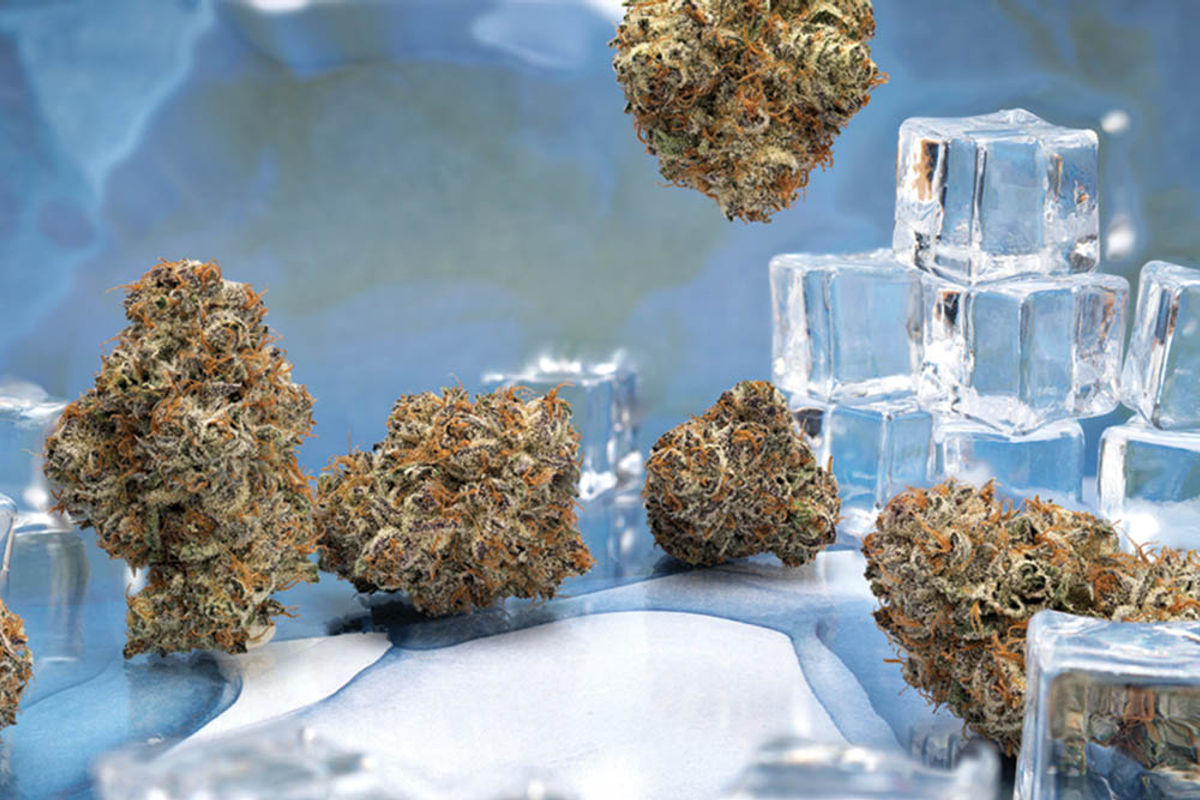 With its thick blanket of trichome coverage, robust, rounded nug structure, and confetti of colors (khaki greens, greys, and hidden flares of grape and mulberry purple), it stands out in shelf-appeal. The tacky first crunch of the nug cracking open reveals a nose nestled in mineral, leather and petrol. A quick peek of peppered steak slips through but quickly melts away to reveal something we thought was purely a placebo effect at first. In what comes through as more of a sensation than a scent, there’s a tangible “cold” to this nose. It’s fresh and stimulates the senses in a way different from typical aromas — much like menthol — but without any hint of mint or lingering essence.