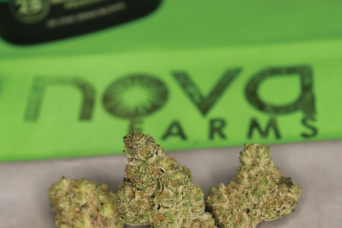 With great packaging, Nova Farms certainly knows how to brand. Their jars are blacked out, with a stickered testing label stuck to the side and a beautiful mandala symbol. Right as you pinch the bottle cap, aromas of skunky gas pour out. This cultivar’s scent profile leans more toward the diesel-y, burnt rubber spectrum of gas, with hints of woody spice.