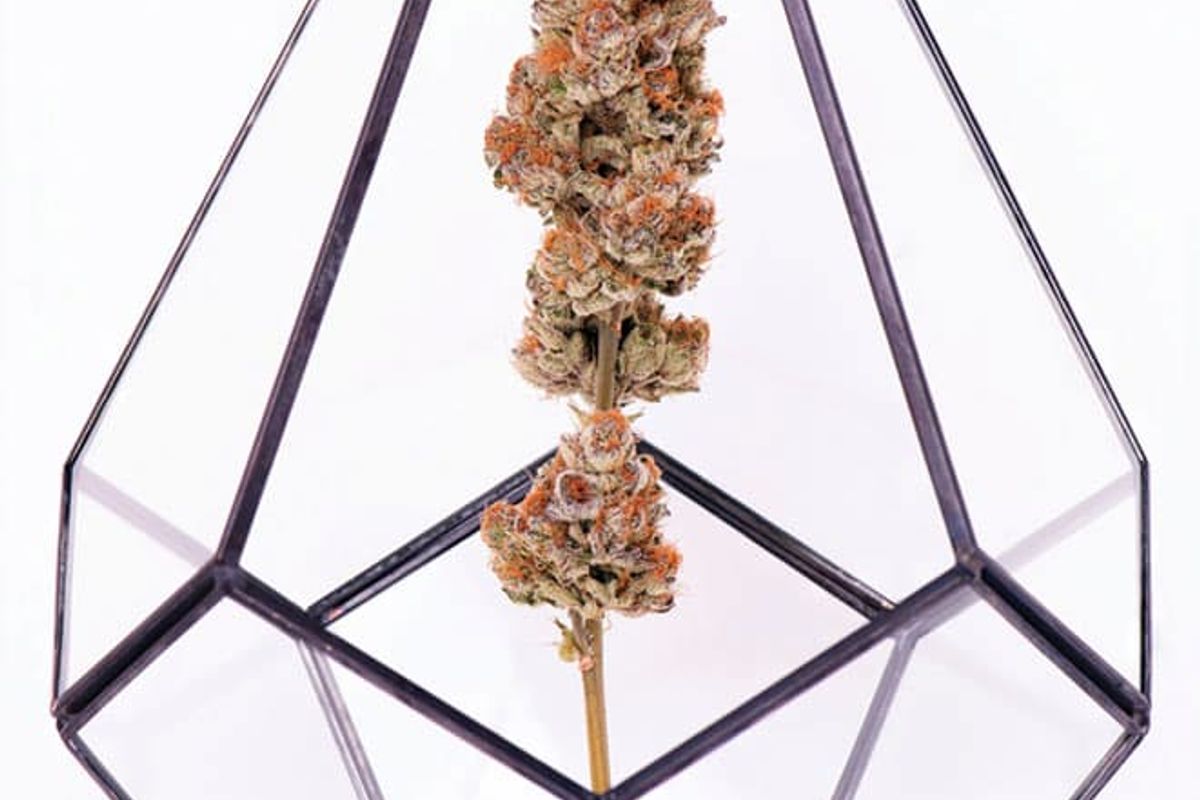 The buds are a classic light-green hue and sport a shimmering coat of dense, sticky trichomes, interspersed with bright orange hairs. The nugs themselves are moderately chunky with a very slight sponginess to them – there’s a touch of moisture left, which is a good indication that the flowers are nice and fresh.