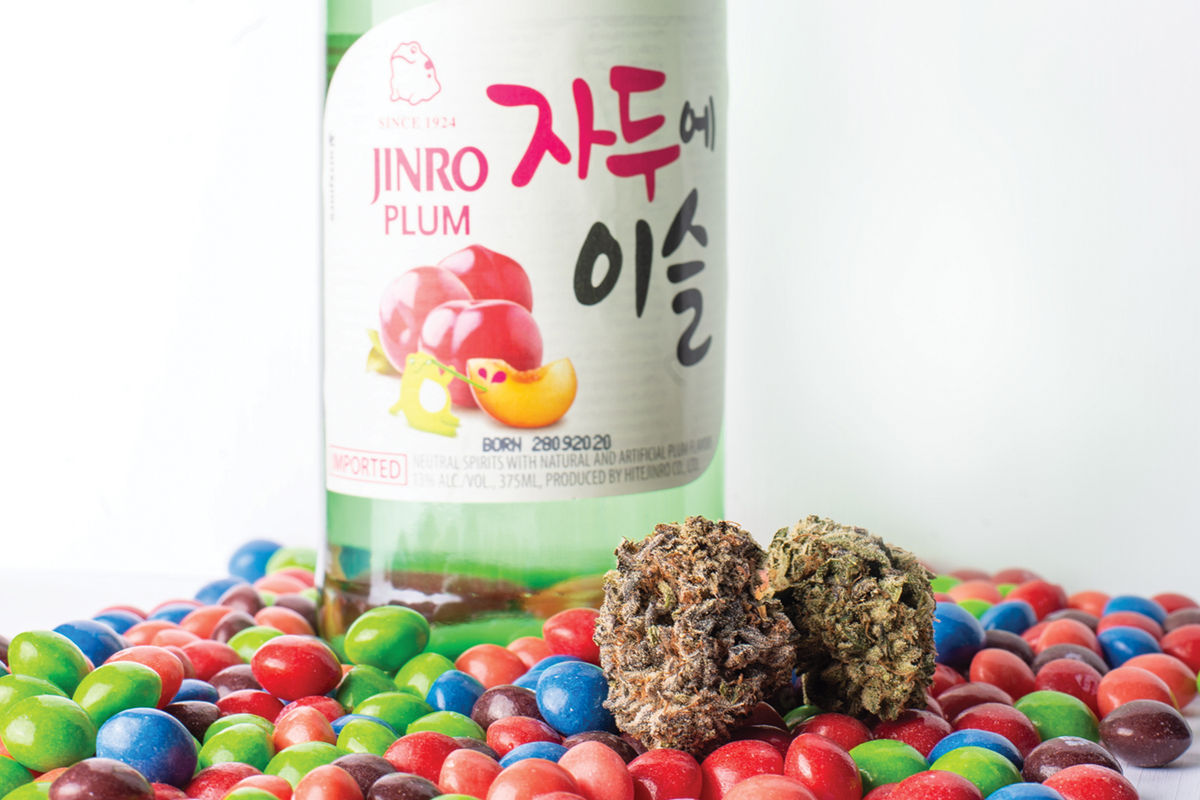 For the pairing, we decided to go with Jinro’s plum-flavored Soju to bring out the sweetness of Sour Zkittelz. Akin to drinking flavored water, the Soju was smooth with a playful splash of plum that delighted our nostrils and taste buds. With the plum flavor still lingering in the back of our throat, we took a big toke of Sour Zkittelz. Just like the Soju, the smoke was pleasantly smooth with a minimal burn. The lemon-lime inhale was met with a subtly sour exhale, and it wasn’t long before we felt the happy, somewhat hyperactive effects of the flower. By the end of the night, our apartment was clean, we’d texted our entire friend group to let them know how awesome they are, and our dog was begging us to calm the eff down. All in all, this was a fun pairing.