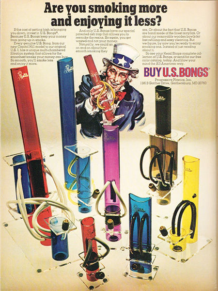 Around the dawn of the 1980s, a new material for making bongs emerged: acrylic. Compared to waterpipes of the past, acrylic bongs were cheaper and more durable. Pioneers of this plastic paraphernalia included US Bongs from Rockville, Maryland (allegedly the first to feature pull-out downstem carbs) and a Milwaukee-based company called G.Graphics.
