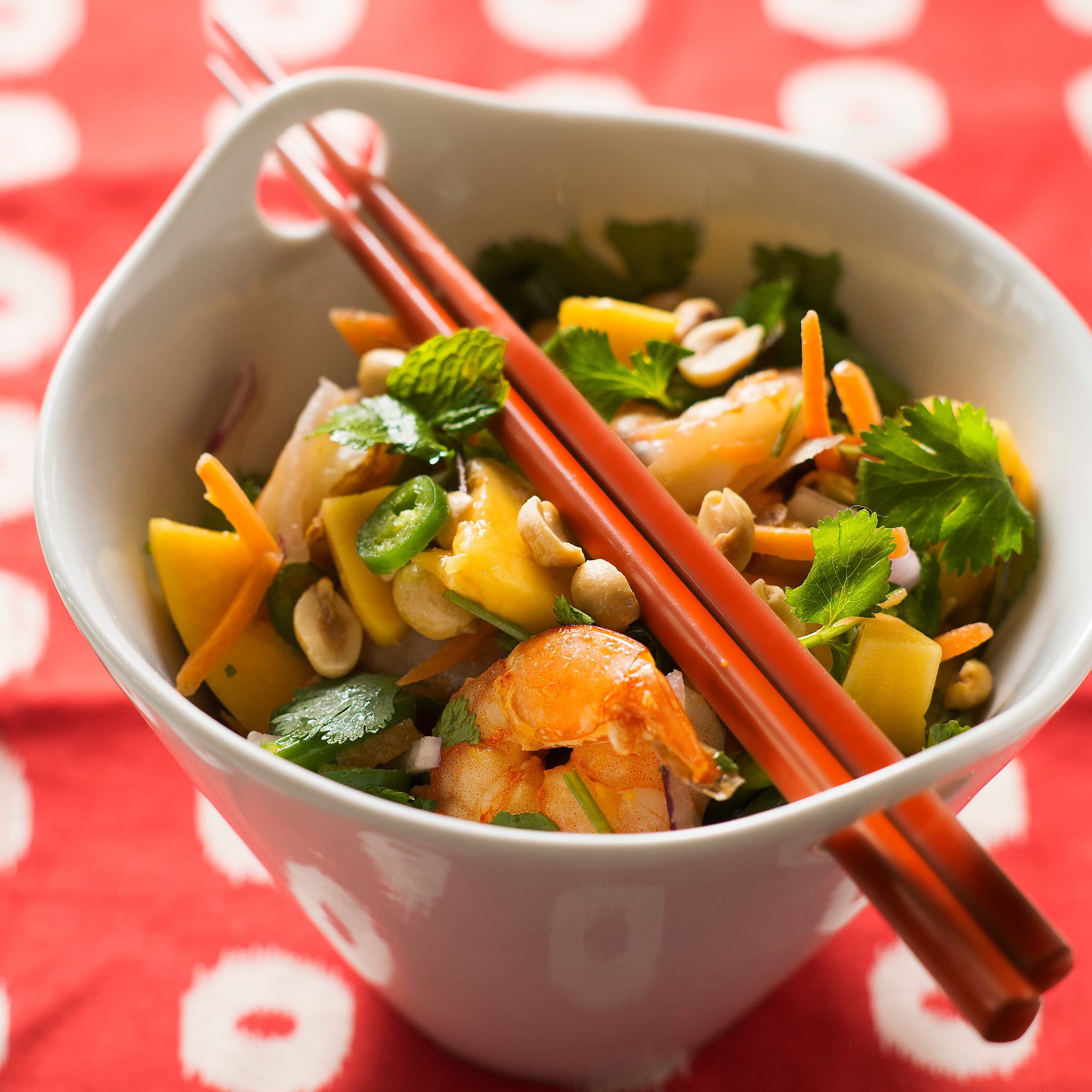 This is a great warm-weather salad, with an interesting mix of flavors, colors and textures. I love pairing shrimp with papaya, and the garnishes of mint, cilantro and peanuts really bring it all together.