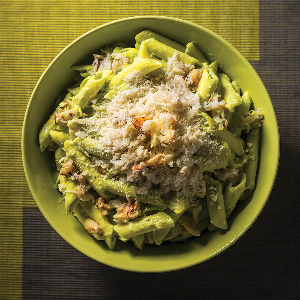 3. In the bowl of a food processor, puree the avocado, scallion, garlic, lemon zest and juice, and parsley. With the machine running, add the oils in a steady stream until the mixture is a smooth paste. Thin with pasta water if too thick.