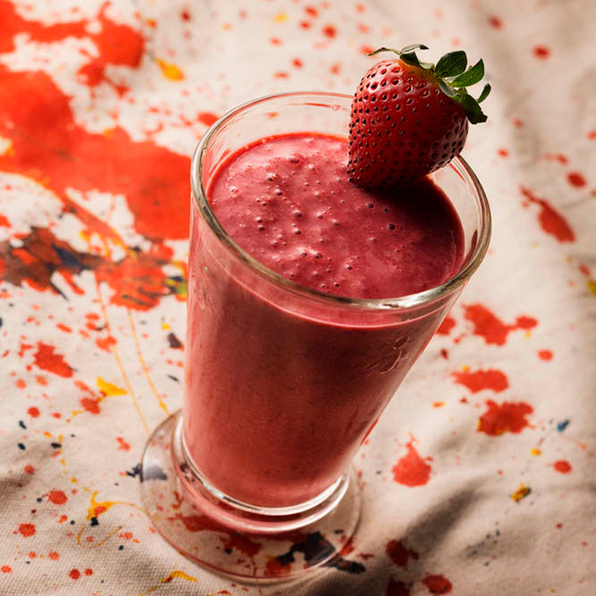 4. Adjust consistency with more liquid or ice if needed. Top with a strawberry.
