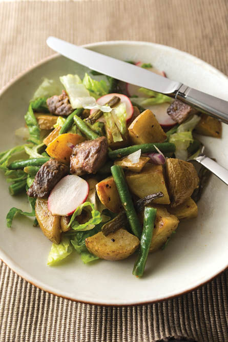 5. In a large bowl combine the lettuce, steak, red onion, radishes and cooked vegetables. Toss with the dressing and serve.