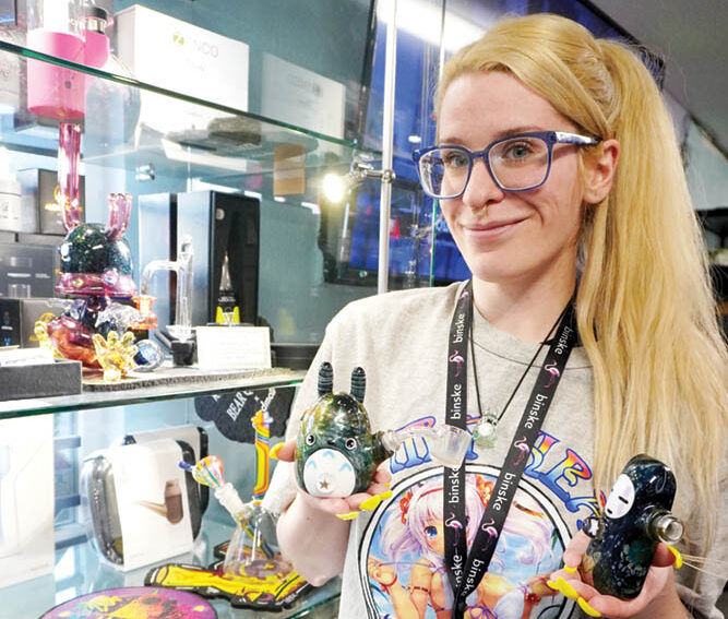 Euphorium is a “Cannabis lifestyle” shop selling serious heat and heady accessories with locations in Covington, Lynwood, Vashon and Woodinville. This month we chatted with Riley Sessions from the Woodinville location – a self-proclaimed sneakerhead and hashhead – about her smoke stash, glass collection and custom shoe art! Check out Riley’s rad creations at @weednerd!