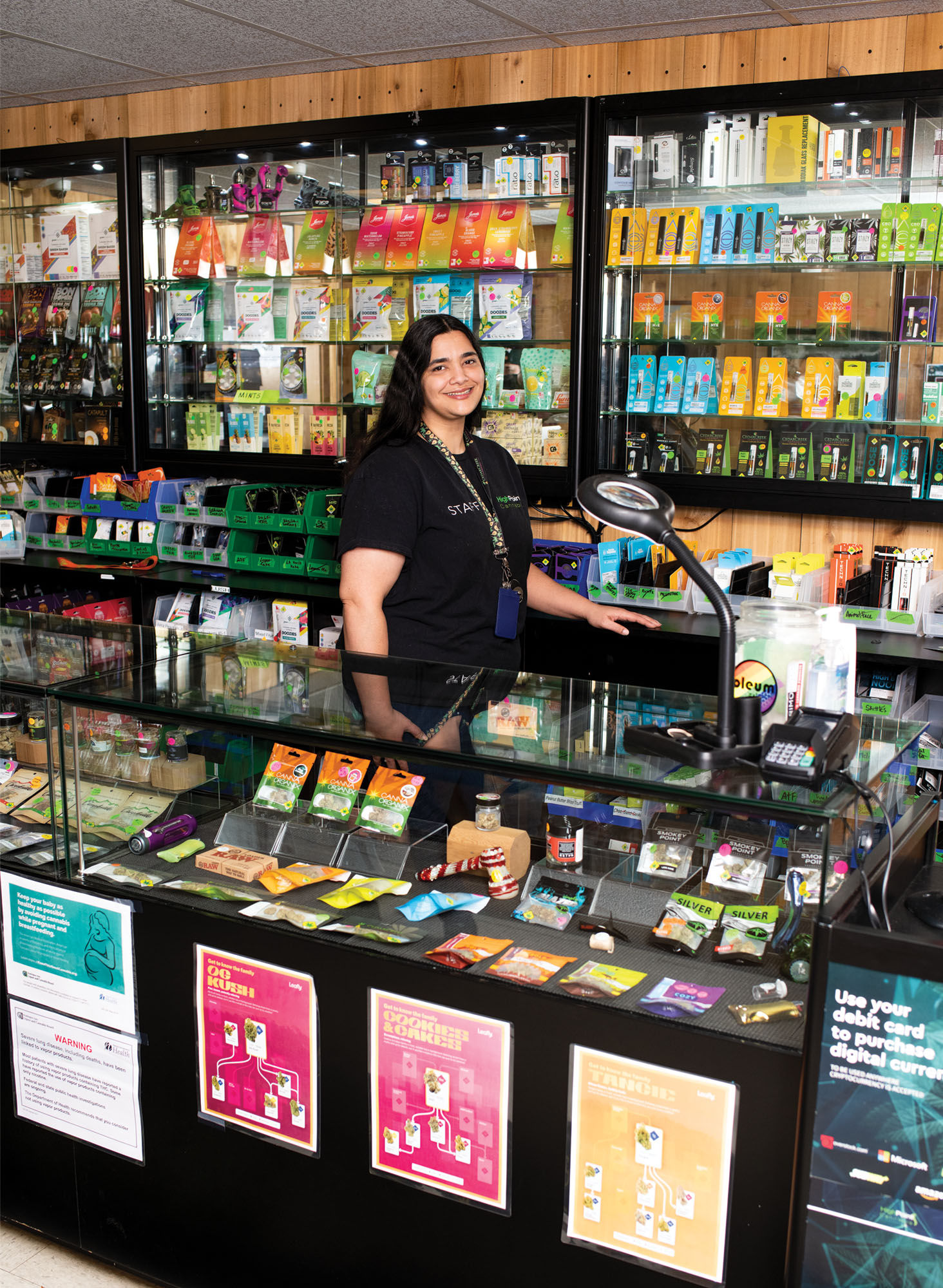 This is sort of embarrassing, but I pee on myself sometimes because the MS causes the nerves to misfire. And the CBD helps prevent me from having those accidents. It also helps with my falling because I get unbalanced, and it seems to keep my vision from getting too bad for times like when I check IDs. The THC helps a lot more with my pain. Within an hour the lower back pain will be gone and my stomach calms down. One day I probably won’t be able to work, so I’m savoring every moment of my job because I love it so much.
