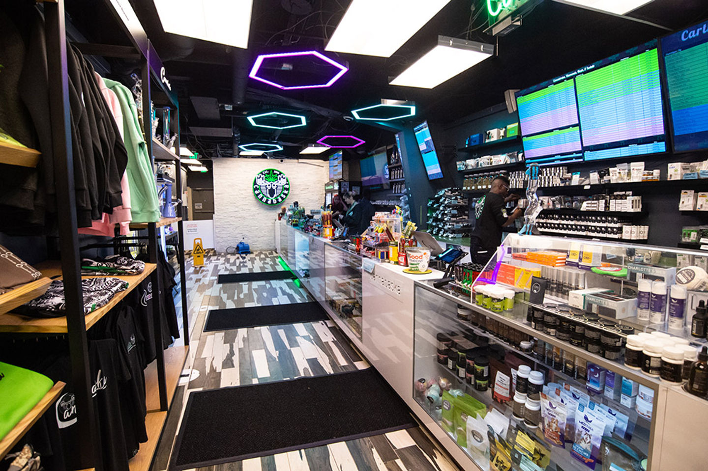 The bright green, somewhat plain-looking exterior of Cannabaska’s Tudor location betrays the cool, urban vibe inside. From the moment you swing open the front door, you are transported to a luxury Cannabis-purchasing experience. The two-toned wooden floors offer a beautiful contrast to the low lighting and slate gray walls. Large neon octagons on the ceiling and EDM music emanating from hidden speakers produce a hip nightclub vibe – putting you in the mood to drop some cash.
