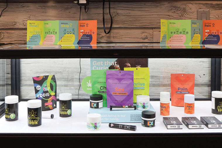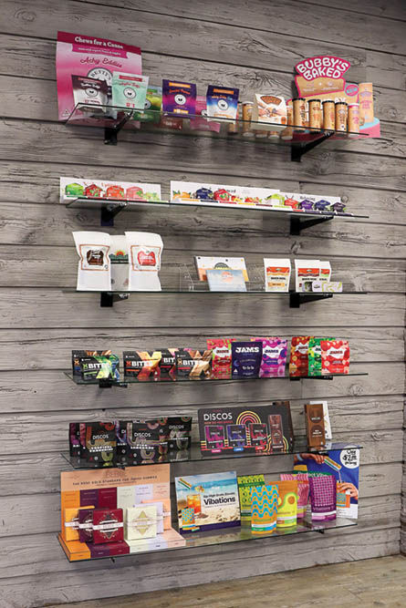 A solid mix of gummies, drinks, chocolates and candies frequent the menu at FLWR. The store also had the newest offering from Keef: Life H2O, a sparkling, low-calorie, low-sugar drink with THC and different flavors containing various cannabinoid mixtures. The Blueberry Lemon Snooze flavor on the FLWR menu has 10 milligrams of THC and 10mg of CBN, while the Strawberry Kiwi Balance flavor has 10mg of THC and 5mg of CBG.