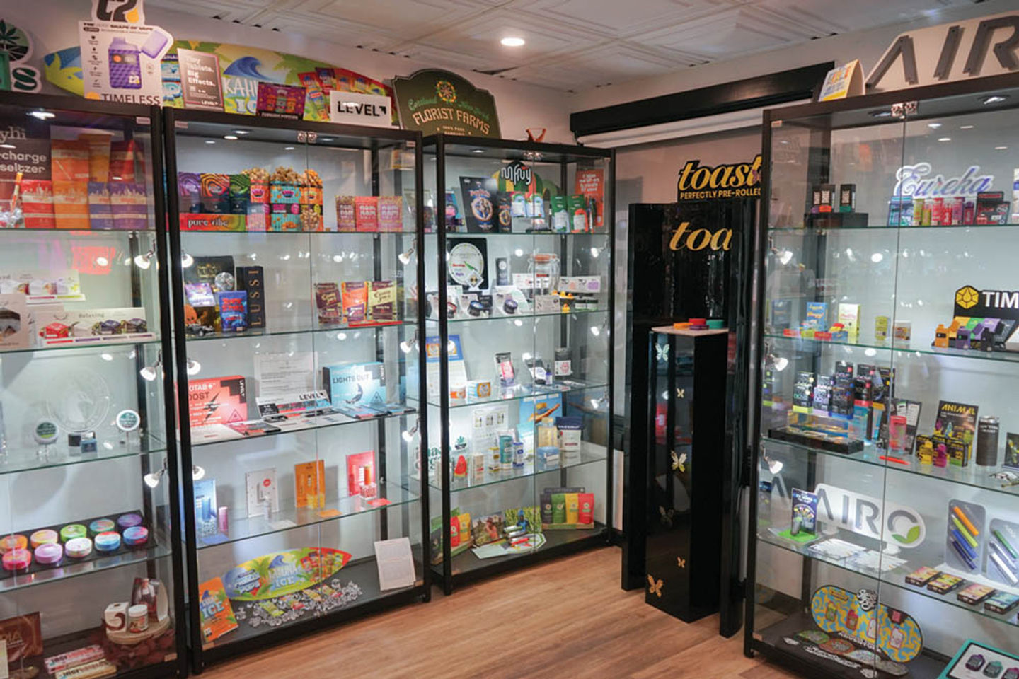 While nearly 40% of their customers do preorders for pickup, those who want to peruse the shelves themselves will find aroma-releasing display cases of all of the flower products in a circular center console you can’t miss. The display allows customers to see, smell and maybe imagine the taste of what they are about to scoop.