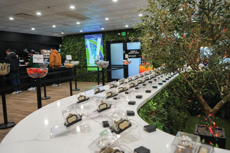 When walking into the store, there are a few ways consumers can interact with the menu: They can go to one of the massive touch screen displays, peruse the aisles or go to the large front desk lined with budtenders who could help guide them down the rabbit hole.