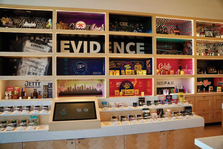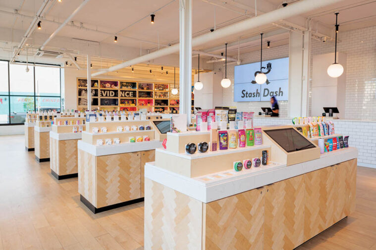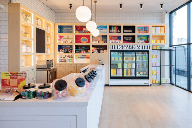 With an impressive 2,800 square feet of retail space, Stash Dash has an aesthetic that brings together the vibe of a vintage 1930s drugstore with a modern floor plan. Tall windows and clean, white subway tiles provide a backdrop for jars of colorful edible samples, and shoppers can taste many of these options before they buy (don’t worry, they’re nonmedicated). On the sales floor, wooden displays feature every product free from glass cases, allowing you to inspect the packages, and you can smell the flowers via clear boxes containing sample buds.