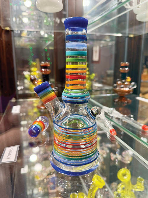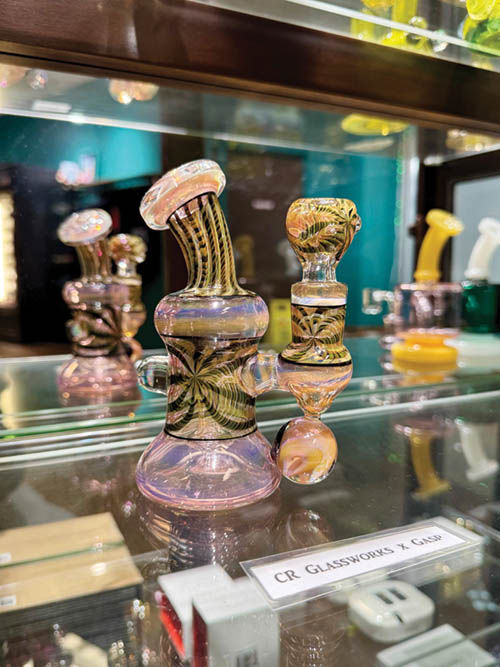 Walking into THC, there is a clear intention in curating an environment that shows respect to Cannabis counterculture beyond simple retail design. There are fragmented blotter sheets made by local glassblowing maestro Mike Gong, hand-drawn designs by famous tattoo artist Winston the Whale and even a large mural outside the building by graffiti legend GATS. Both store locations also feature a display case filled with awe-inspiring pieces by popular flameworkers, such as Kid Glass, Cowboy Glass, Cody Olson and Blueberry Glass.
