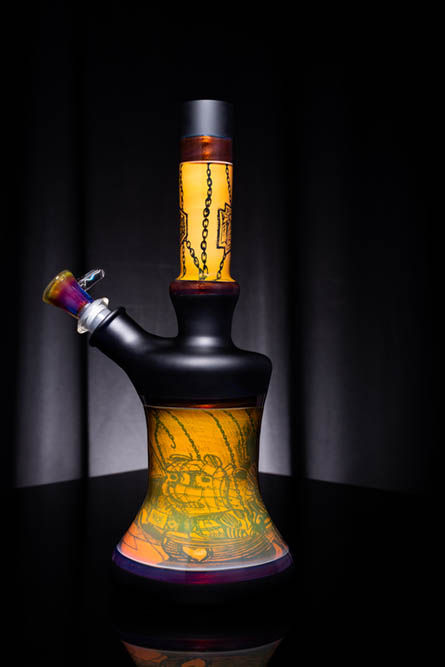 You will see a couple of examples here where Mac either collaborated with others or made pieces himself. He then went on to freehand etch with graphics of another caliber, making these truly one-of-a-kind pieces of art. His most recent drops were at Prism Smoke Shop in New York and Zee Vapor in Illinois. He usually has a piece or two available on his Instagram, so check him out there as well.