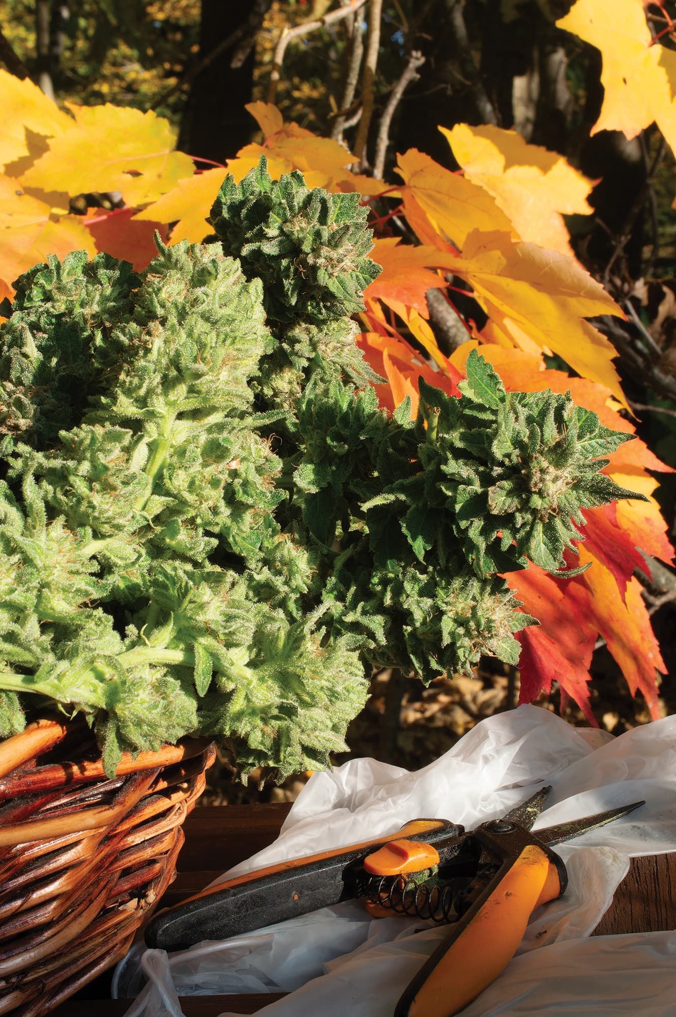 With the cooling of the autumn nights, two of his eight-foot-plus monster plants were quickly finishing out and needed to be cut, trimmed and hung to dry. A pile of yellow and purple-tinted sun leaves covered the ground below the plants, mixed here and there with a few oak and maple leaves from the trees surrounding the backside of the property.