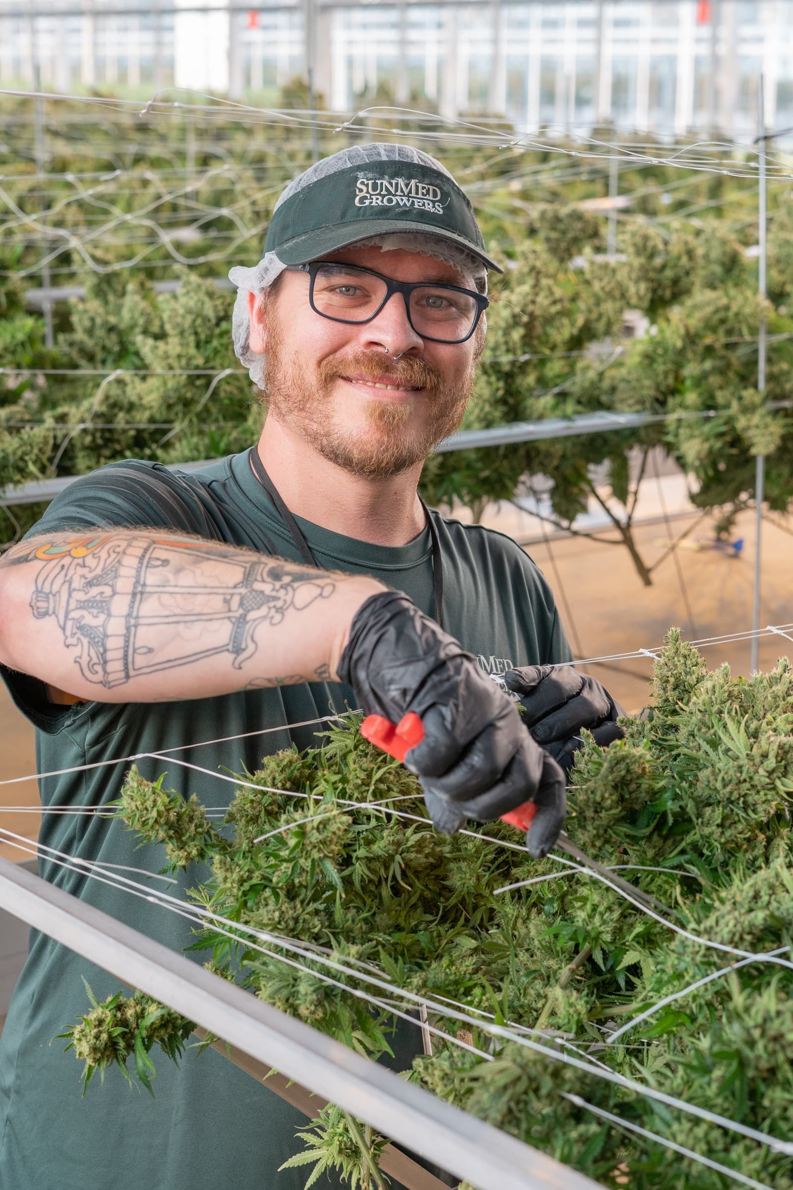 We had the opportunity to soak in some sunshine alongside SunMed’s stunning flowering plants. A sea of green and sunlight hit my face, along with a rich, pungent scent filling my nose. It was impossible to feel anything else but gratitude and happiness in that moment. It was all smiles in the flower room as the harvest team was at work defoliating away. A SunMed harvest team associate offered a quick cultivation tip for our readers: During the last week of flower, aka the flushing period, the plants receive 20 hours of light.