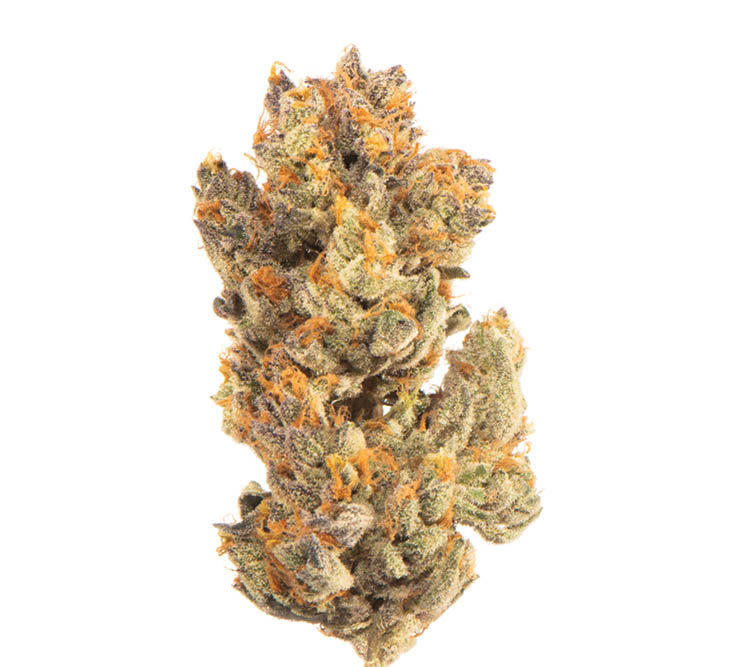 Beautifully light blue- and purple-tinted, this flower has an exotic look and powerful flavor that rocks the senses with a heady hit of kushy Z terps and an undeniably blue-fruited mint garnish. These dense, cluster-sized nugs are so heavily frosted with trichomes that they alter the flower’s color. With an ace cure, the thick, still-sticky buds break up to deliver first notes of the blue color and flavor that are both yummy and hard to describe, along with a sedating euphoria that melts the mind into a puddled body perfect for the sushi buffet. –Review by Wes Abney