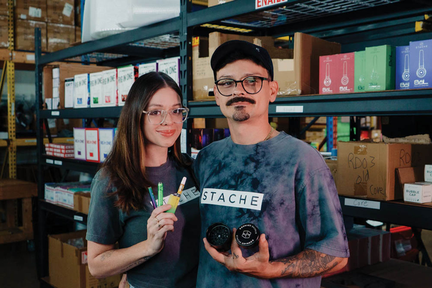 Rod and Missi Santos sit in the Stache Products warehouse across from each other at two separate desks. On both desks sit multiple prototypes and leftover parts of grinders, dab rigs and batteries that serve as a testament to Rod and the company’s innovative vision to push the creative envelope when designing and creating their products.