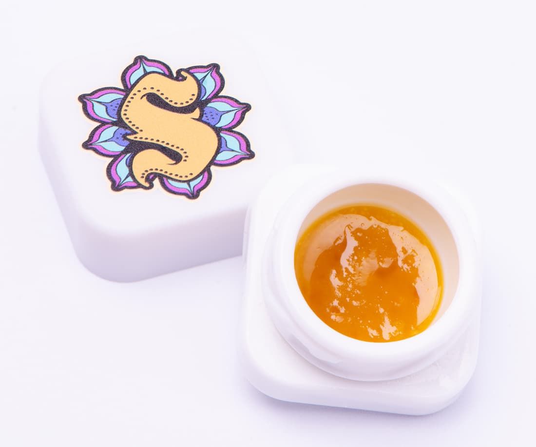 The split jar is one of our favorite trends in the dabbing world right now, because it opens up the potential to highlight different flavors, consistencies and expressions. Real Deal Resin chose to feature two different consistencies from two different extraction methodologies – cold cure rosin and sauce – to showcase the different expressions of the candylicious Rainbow Belts strain, with tasty results.